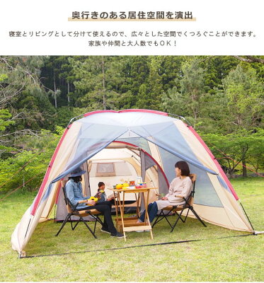 連結すれば、奥行きのある居住空間を演出することができ、 寝室とリビングを分けて使用できるので、大人数でも快適! 連結する際は、スクリーンテントのオープン面にテントを入れる だけなので、初心者の方にもおすすめです。